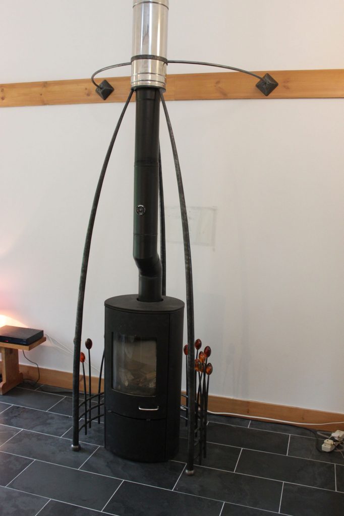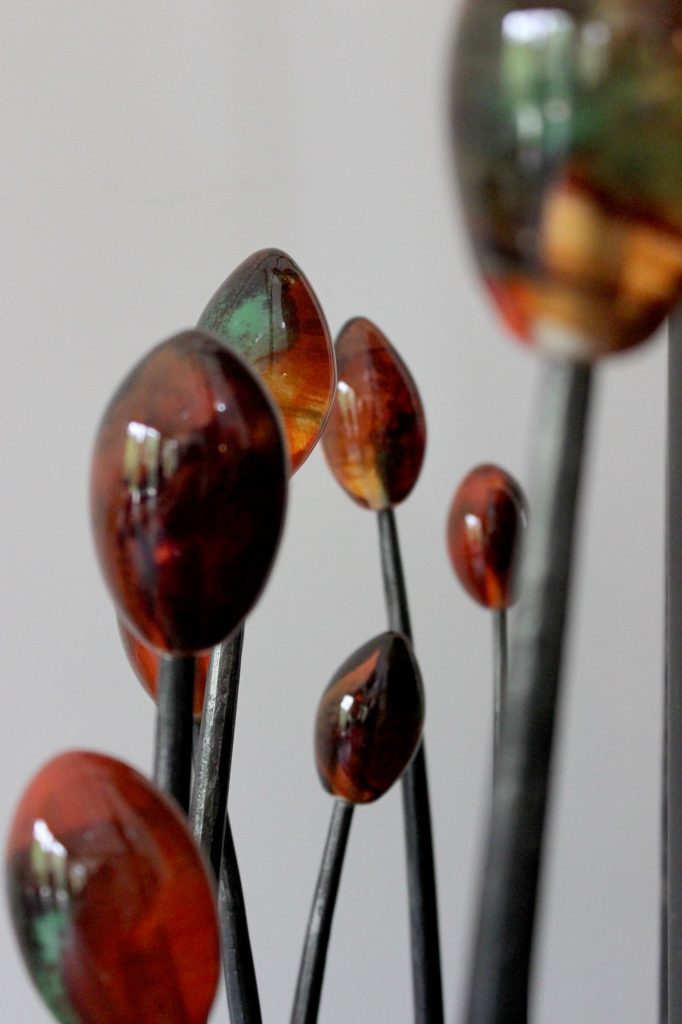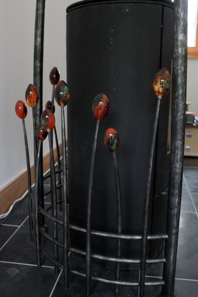Fire surround with custom made glass seed heads by Jonathan Ball. Forged, brushed and waxed mild steel and glass.